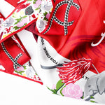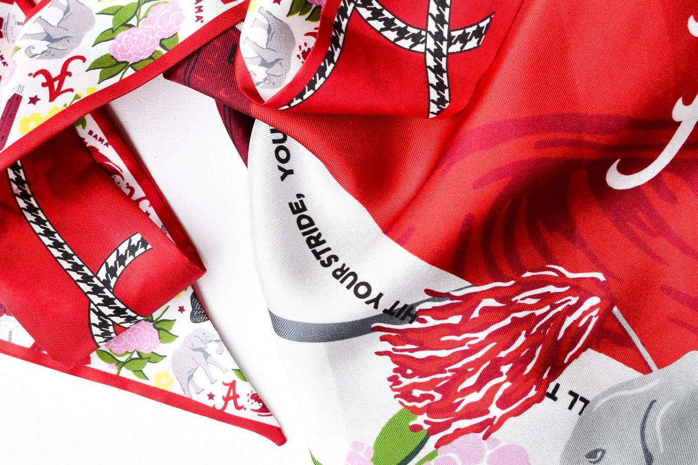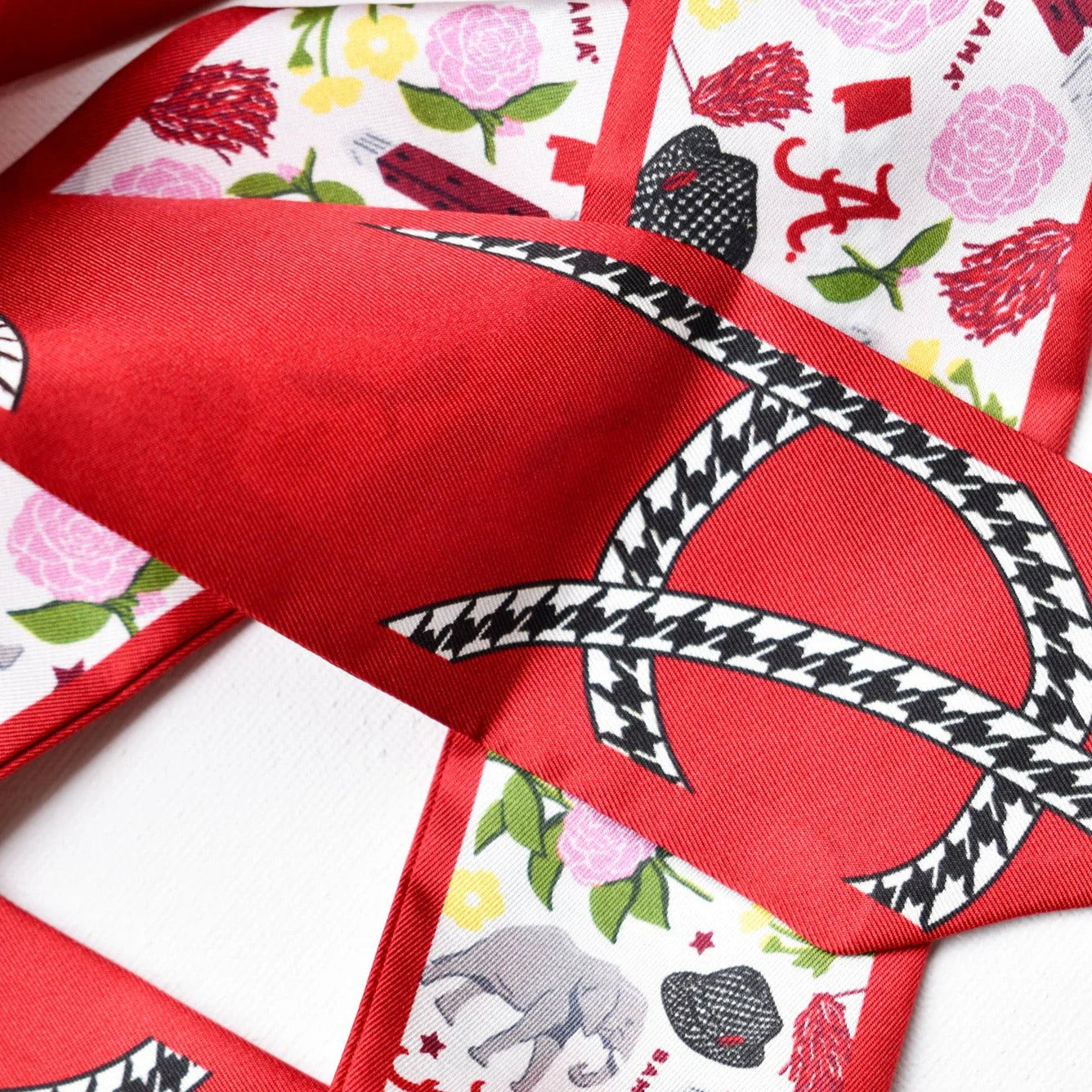 Cheer on the Crimson Tide in timeless style with this officially licensed University of Alabama silk twilly scarf. Made from 100% silk twill, this luxe accessory measures 2 inches by 36 inches and features a double-sided design: our exclusive Roll Tide floral print on one side and a classic houndstooth twist on the other—two iconic Bama motifs in one elegant scarf.