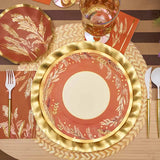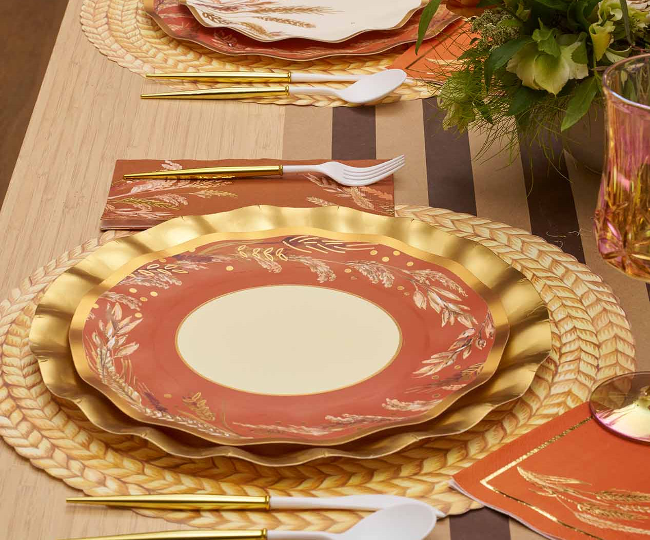 Celebrate the season in style with our Harvest Wavy Dinner Plates, crafted in a soft white hue with elegant golden wheat detailing and finished with a luxurious metallic gold trim. The gently curved edges add a contemporary touch to their rustic charm, making them perfect for autumn gatherings, Thanksgiving feasts, or festive dinner parties. Both beautiful and practical, these plates offer the sophistication of fine tableware with the ease of disposable use.