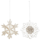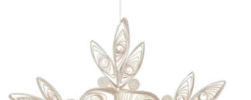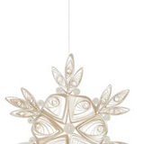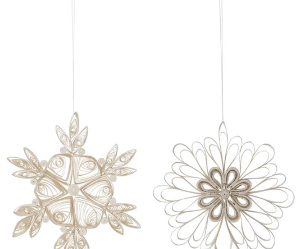 Delicately crafted by hand, this 8-inch snowflake ornament showcases the intricate art of paper quilling using recycled materials. Featuring graceful white coils and curves, each piece is a unique celebration of craftsmanship and sustainability. Available in two charming styles, this ornament adds a natural, wintry elegance to trees, wreaths, and gift toppers alike.