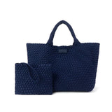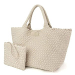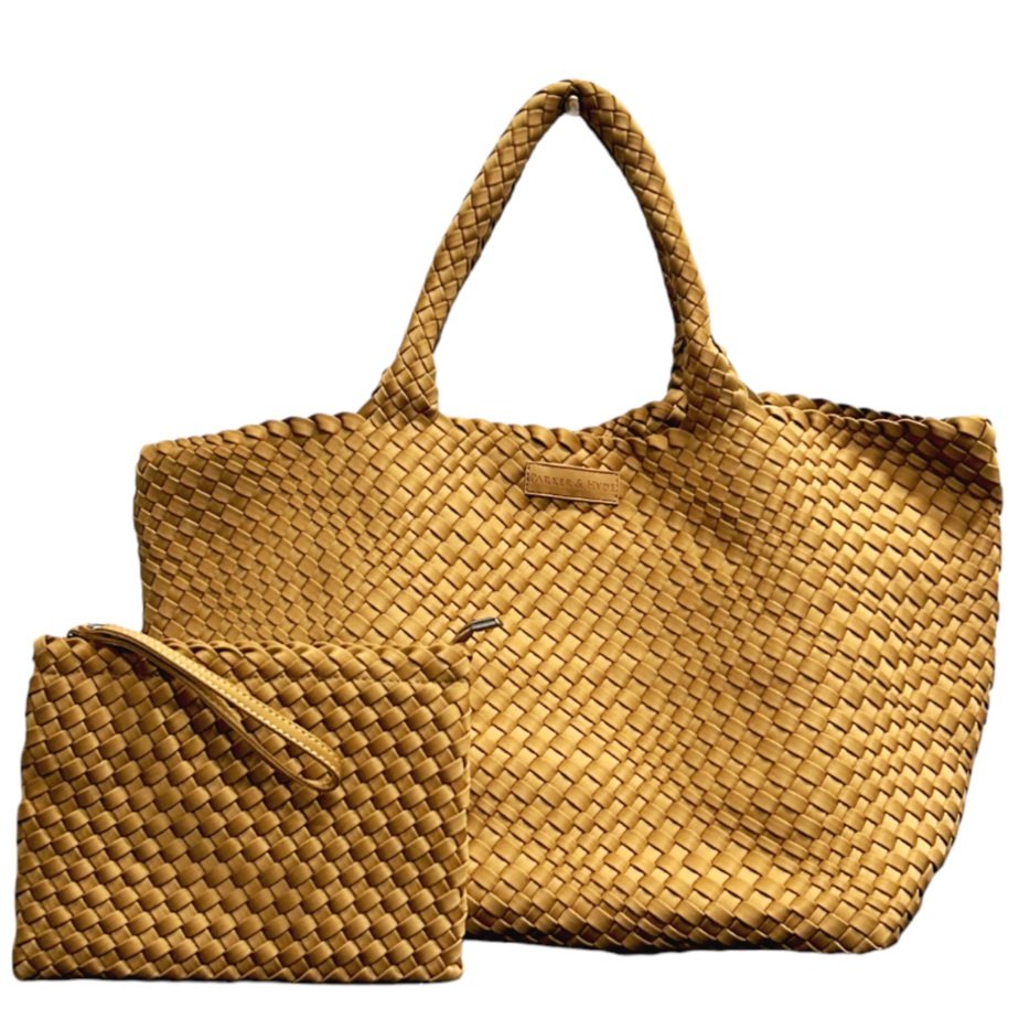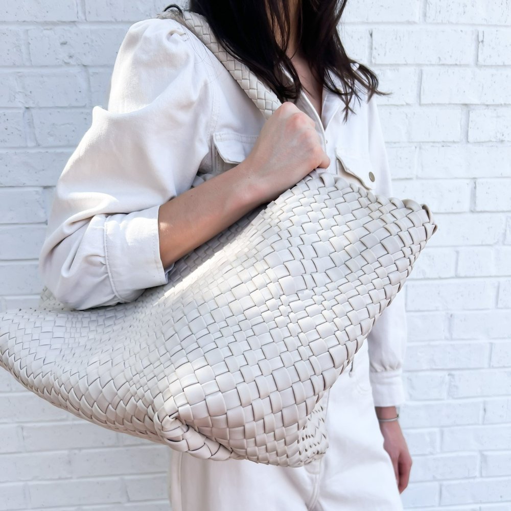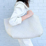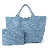 The Oversized Tote is handwoven with a Lycra blend and contrasting weave. This style is ideal for travel, work, gym, or for any girl on the go! Each tote has a magnetic closure and wristlet pouch included.