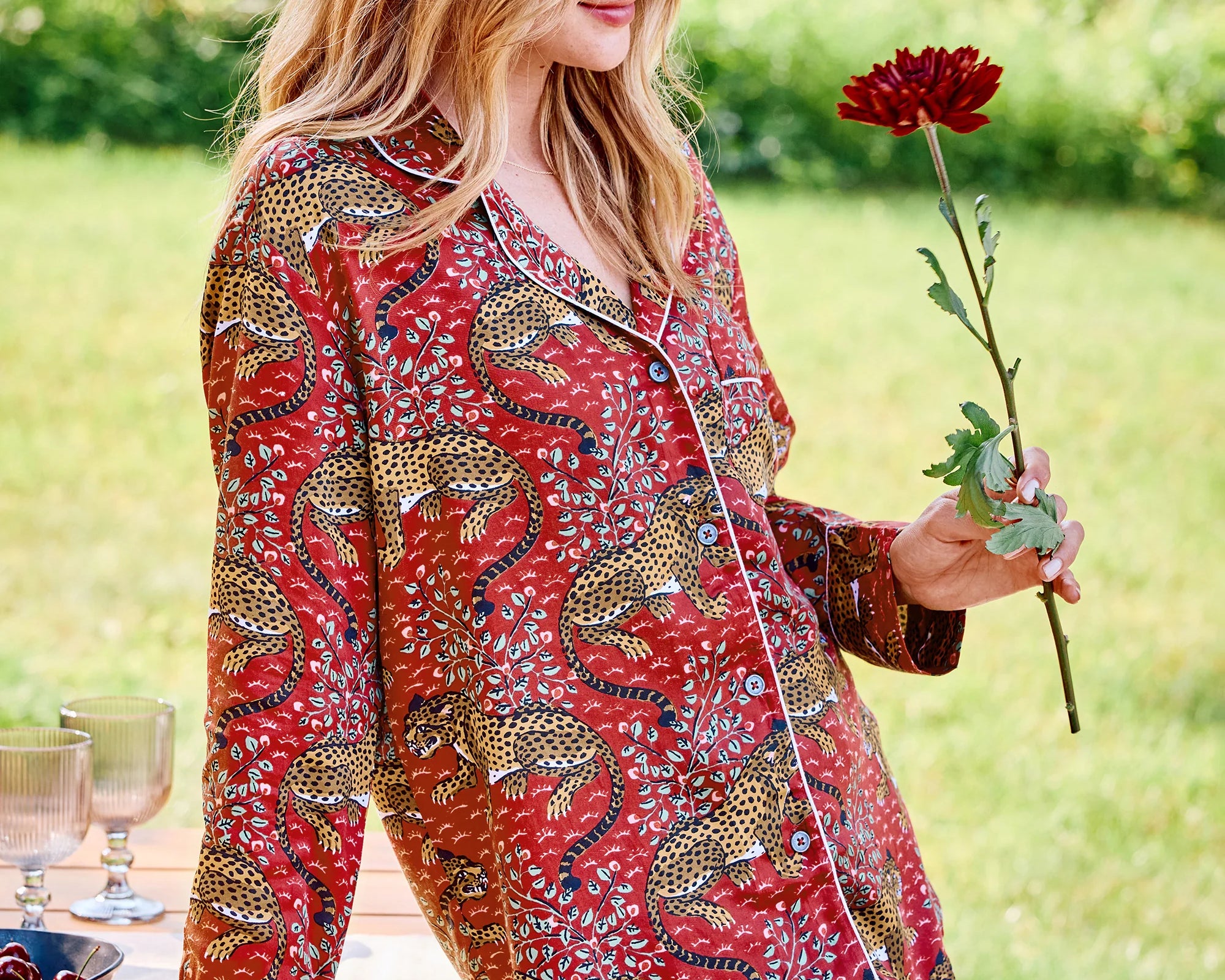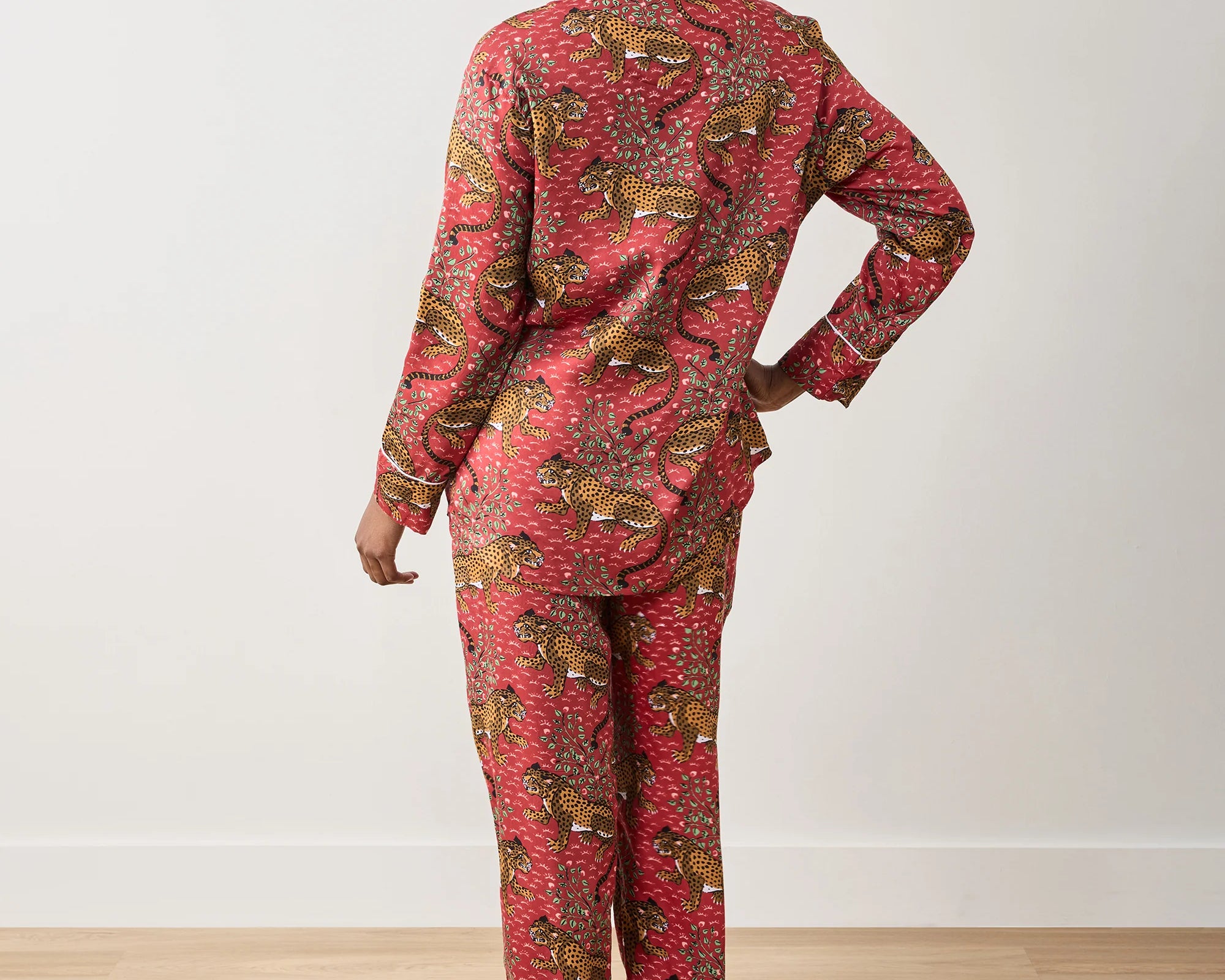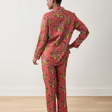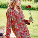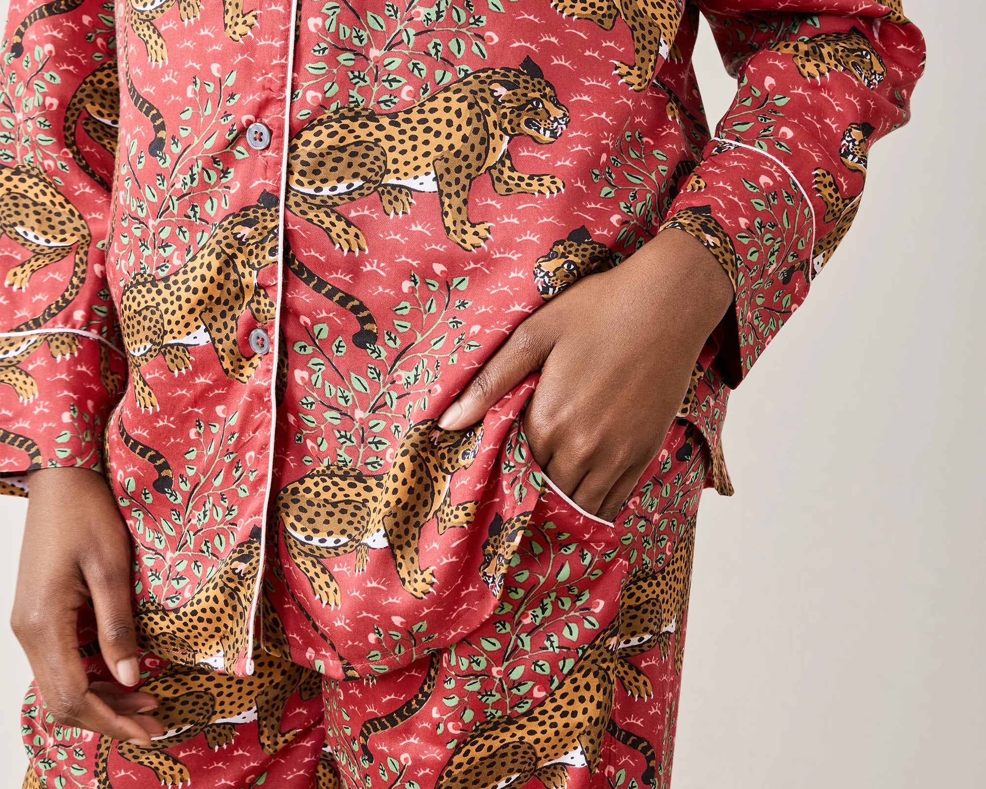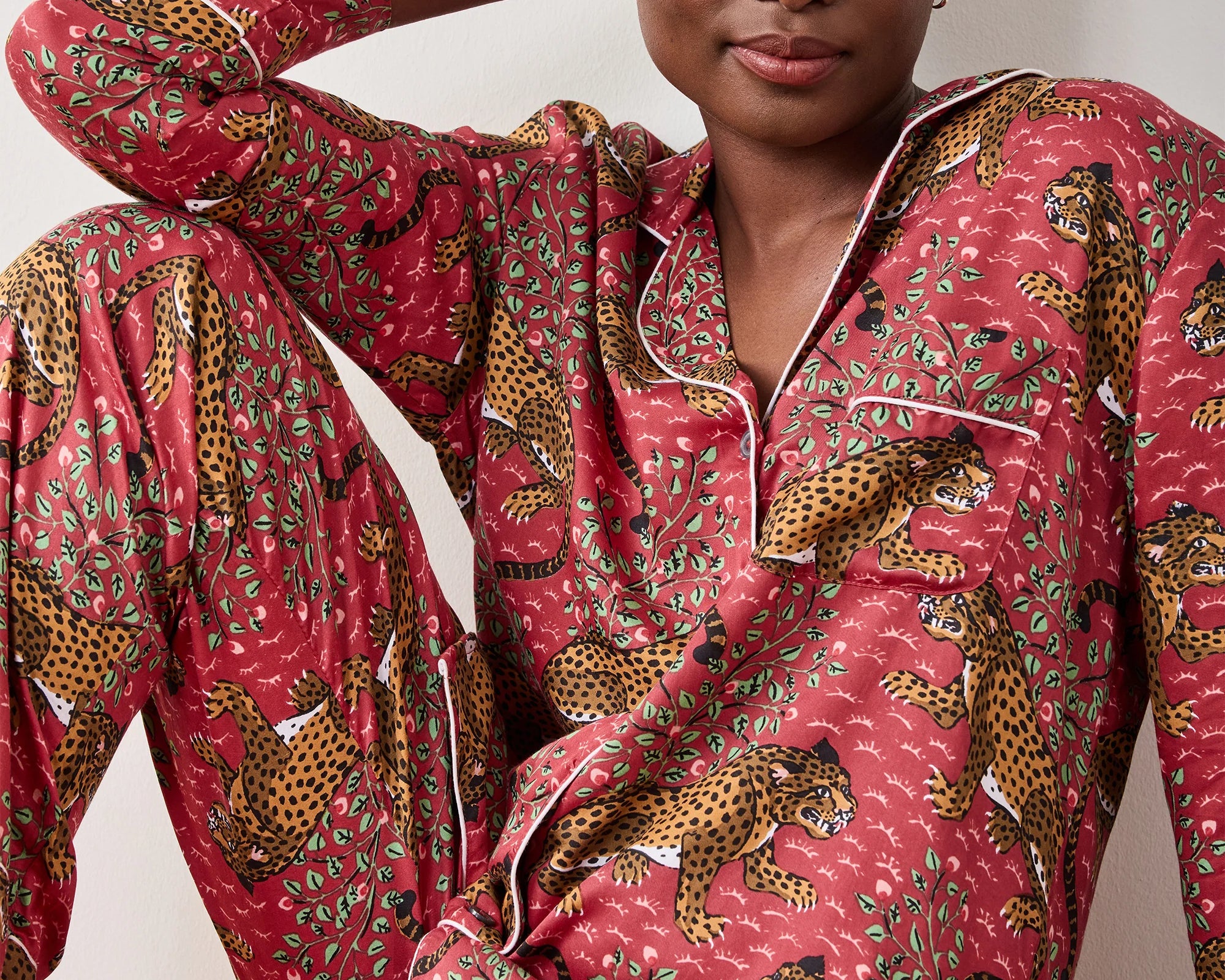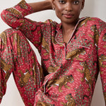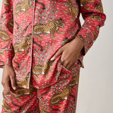 Inspired by vintage textiles and antique jungle cat paintings, the Bagheera Leopard Print Lounge Set brings fierce elegance to your evenings. Crafted from silky, breathable Eco Satin, this women’s lounge set includes a relaxed button-down top and mid-rise pants with pockets. The hand-drawn leopard print and luxurious feel make it perfect for both restful nights and stylish lounging.