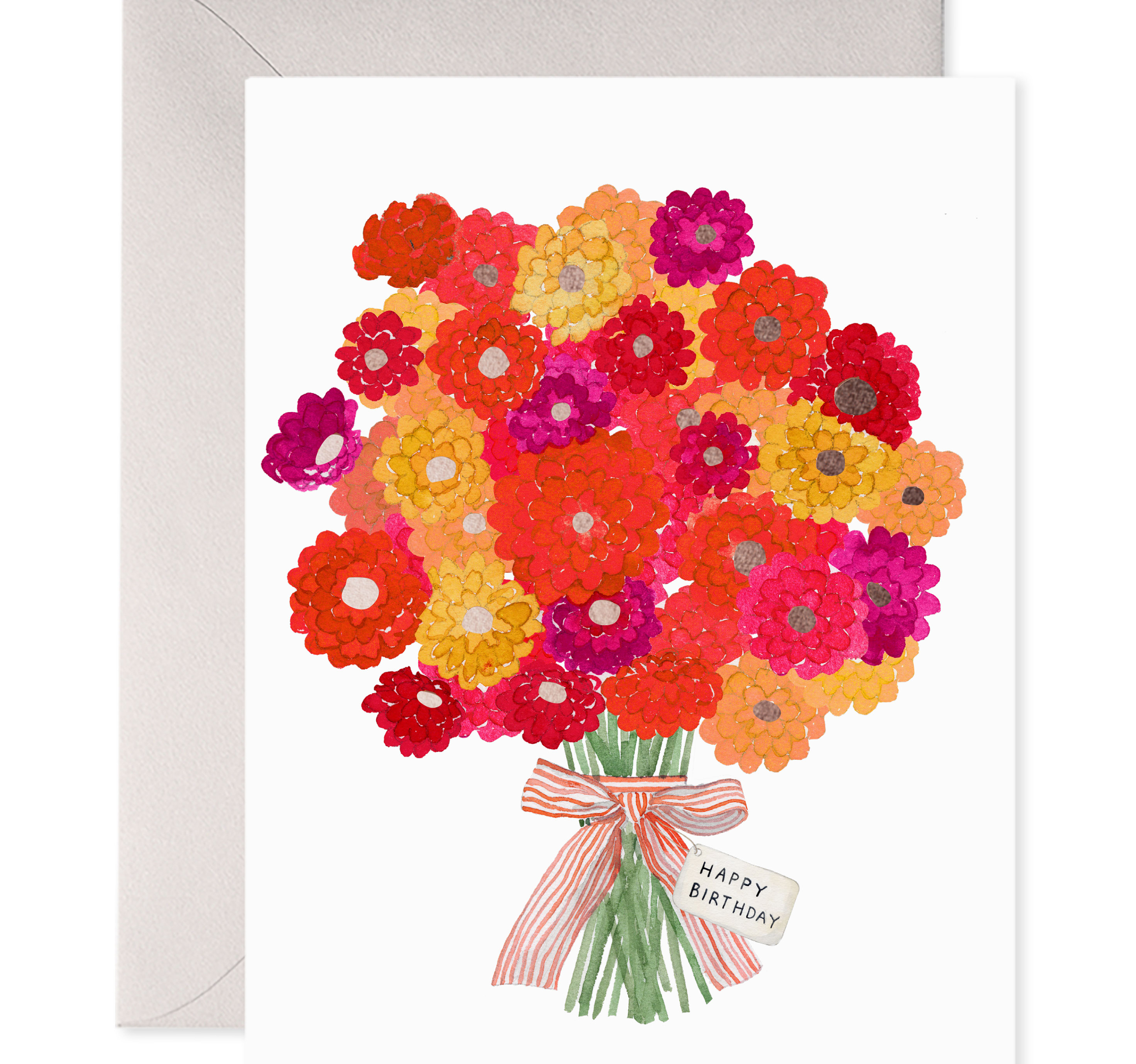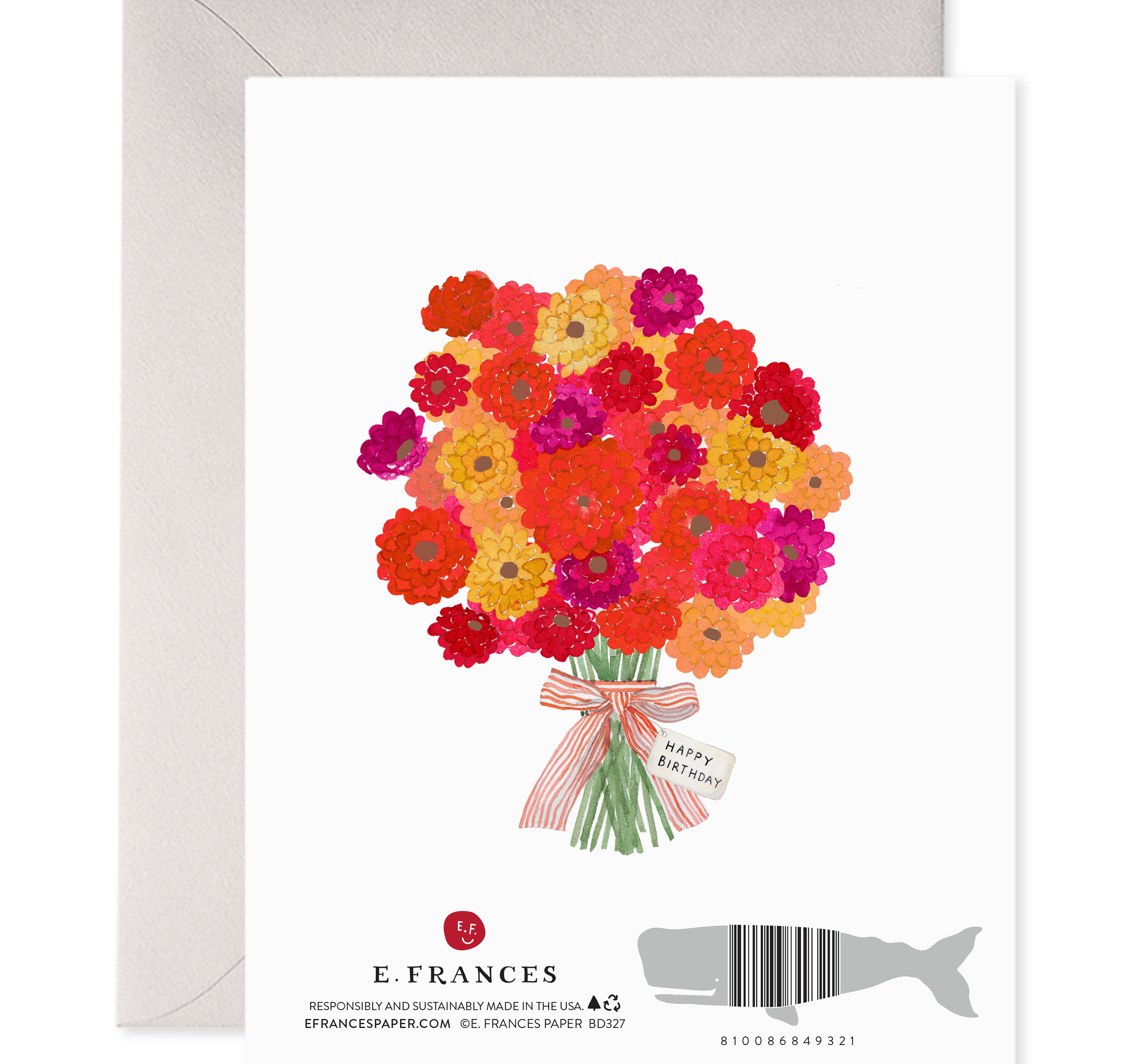 Celebrate their special day with the E. Frances Birthday Bouquet Greeting Card. Featuring a colorful bouquet of fresh flowers tied with a charming striped bow, this cheerful design brings beauty, warmth, and joy to any birthday celebration. It’s a timeless way to send heartfelt wishes with a touch of elegance.