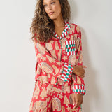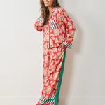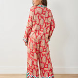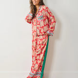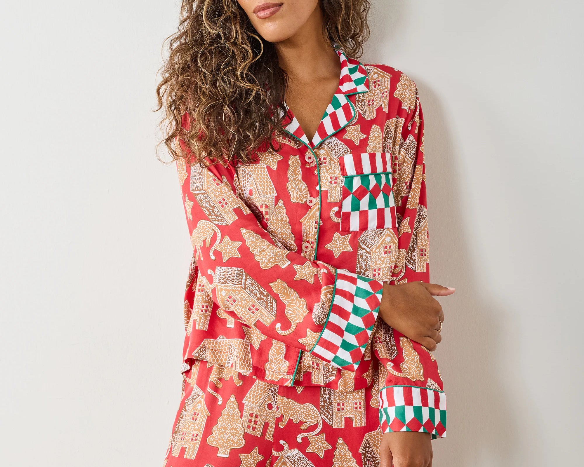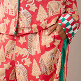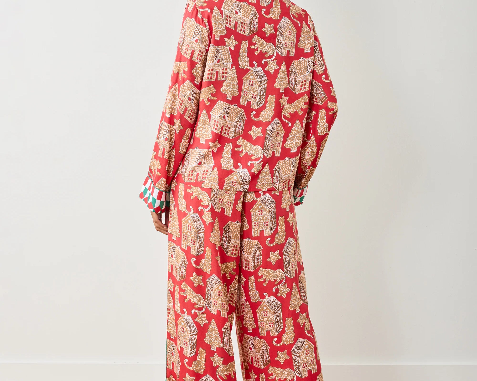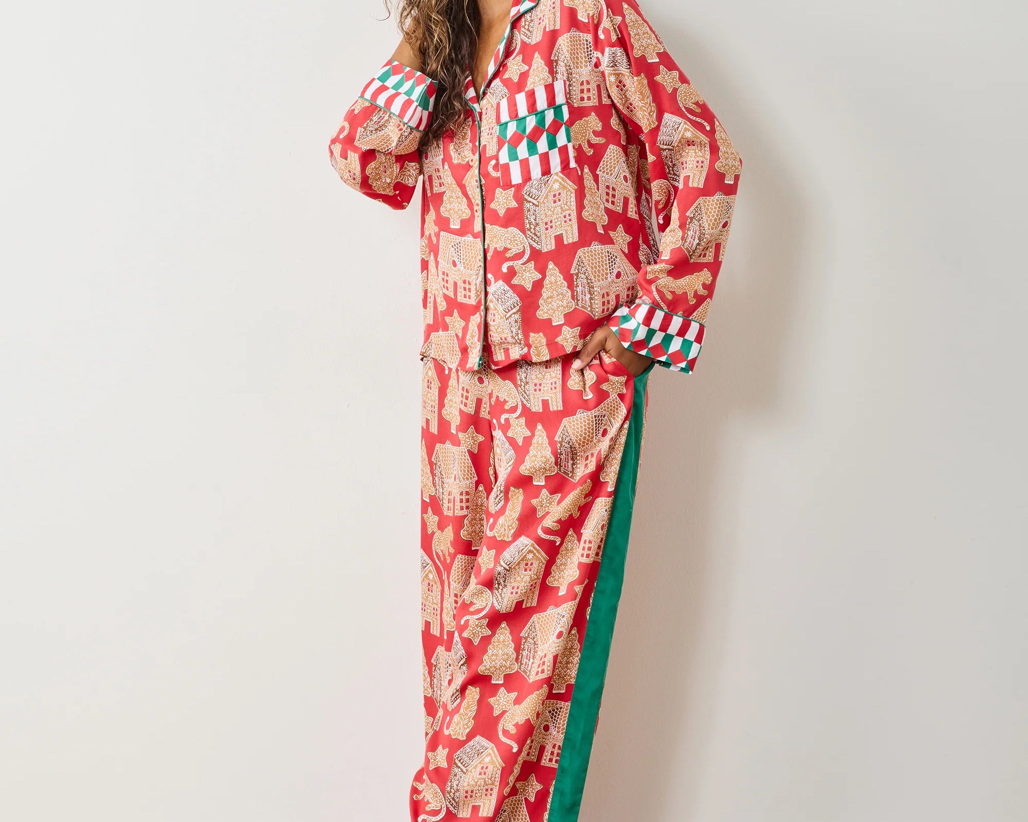 Take a bite out of the season with our Gingerbread Party Satin Pajama Set in festive ruby. A returning fan favorite, this playful set features a charming gingerbread print on luxurious Eco Satin and offers relaxed, oversized comfort. The Rittenhouse lounge set pairs a slightly boxy top with wide-leg pants, complete with deep pockets, creating the perfect combination of cozy style and holiday cheer for nights by the tree.