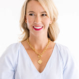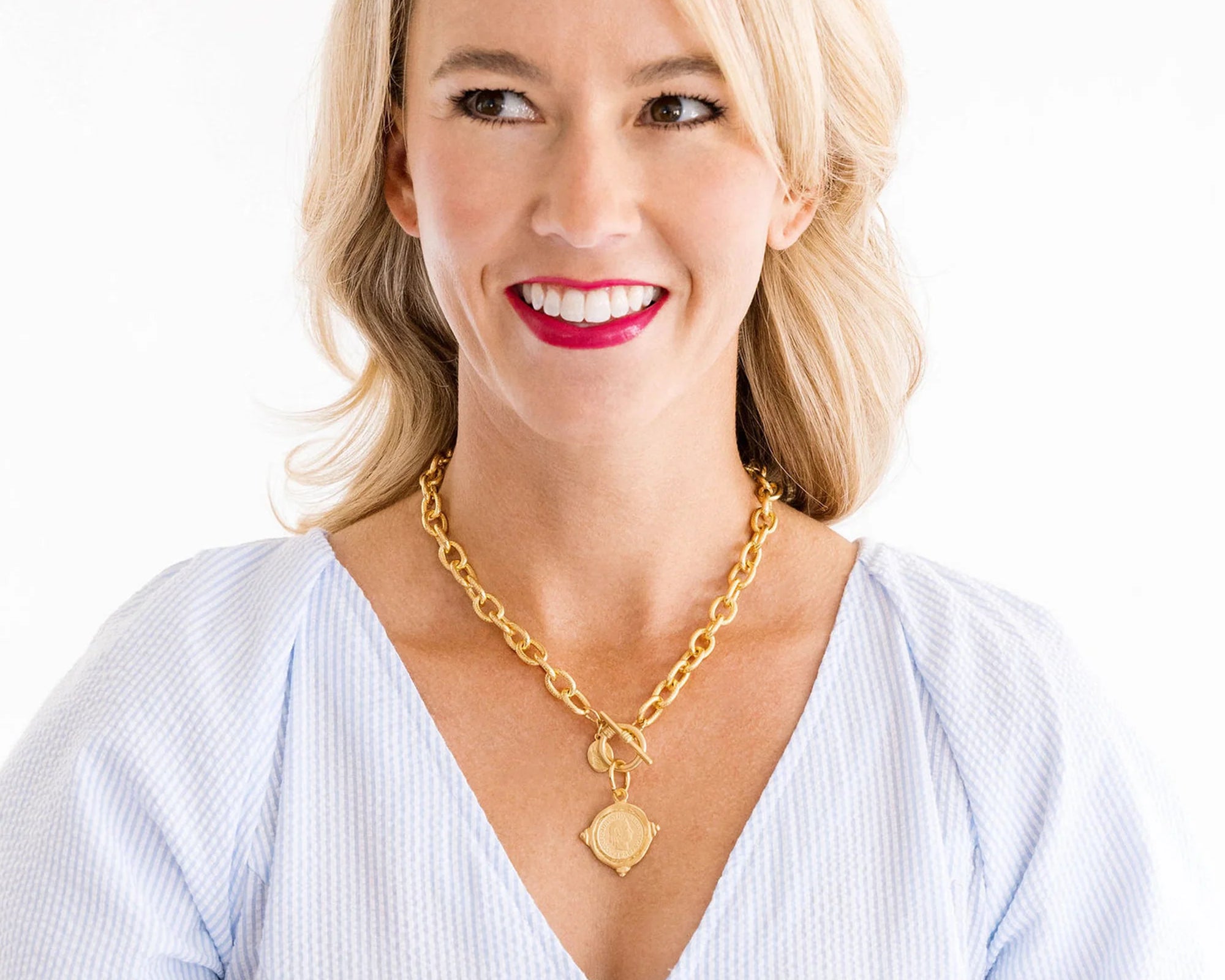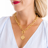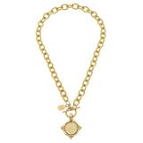 The coin is set on a textured toggle chain, available in 16-inch length, and finished in your choice of triple-plated 24k gold. The toggle clasp adds an effortless, secure closure while enhancing the necklace’s timeless aesthetic.