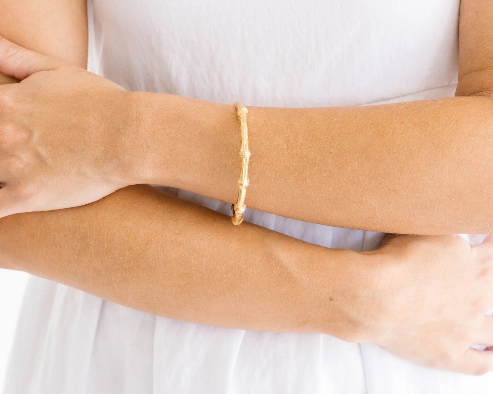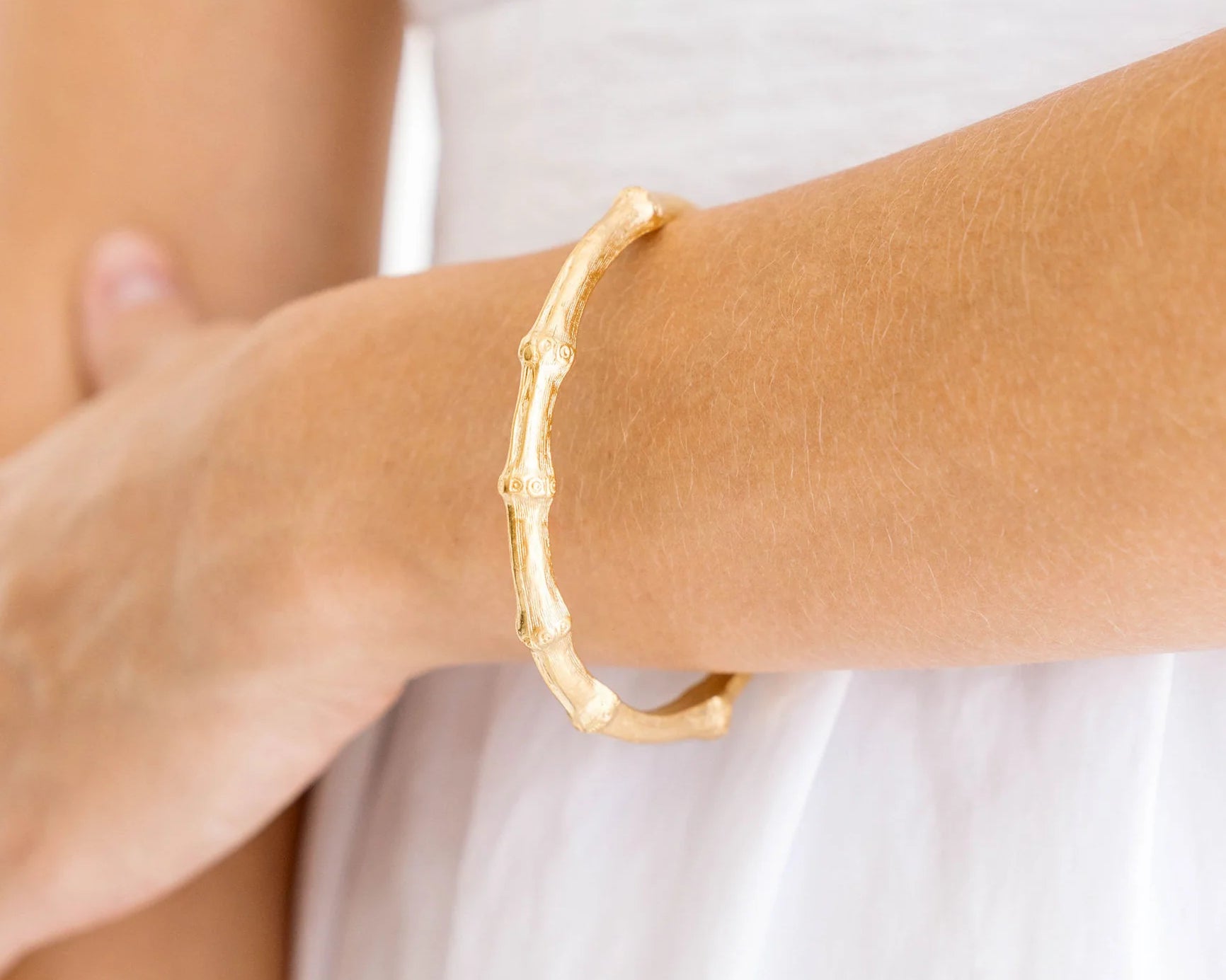 Timeless, natural, and effortlessly chic—the Susan Shaw Gold Bamboo Bangle brings a touch of organic elegance to any look. Inspired by vintage bamboo designs, this handcrafted bangle captures the beauty of carved bamboo detailingin a triple-plated 24K gold finish. Its approximate 2.75-inch diameter makes it ideal for layering or wearing solo as a statement piece.