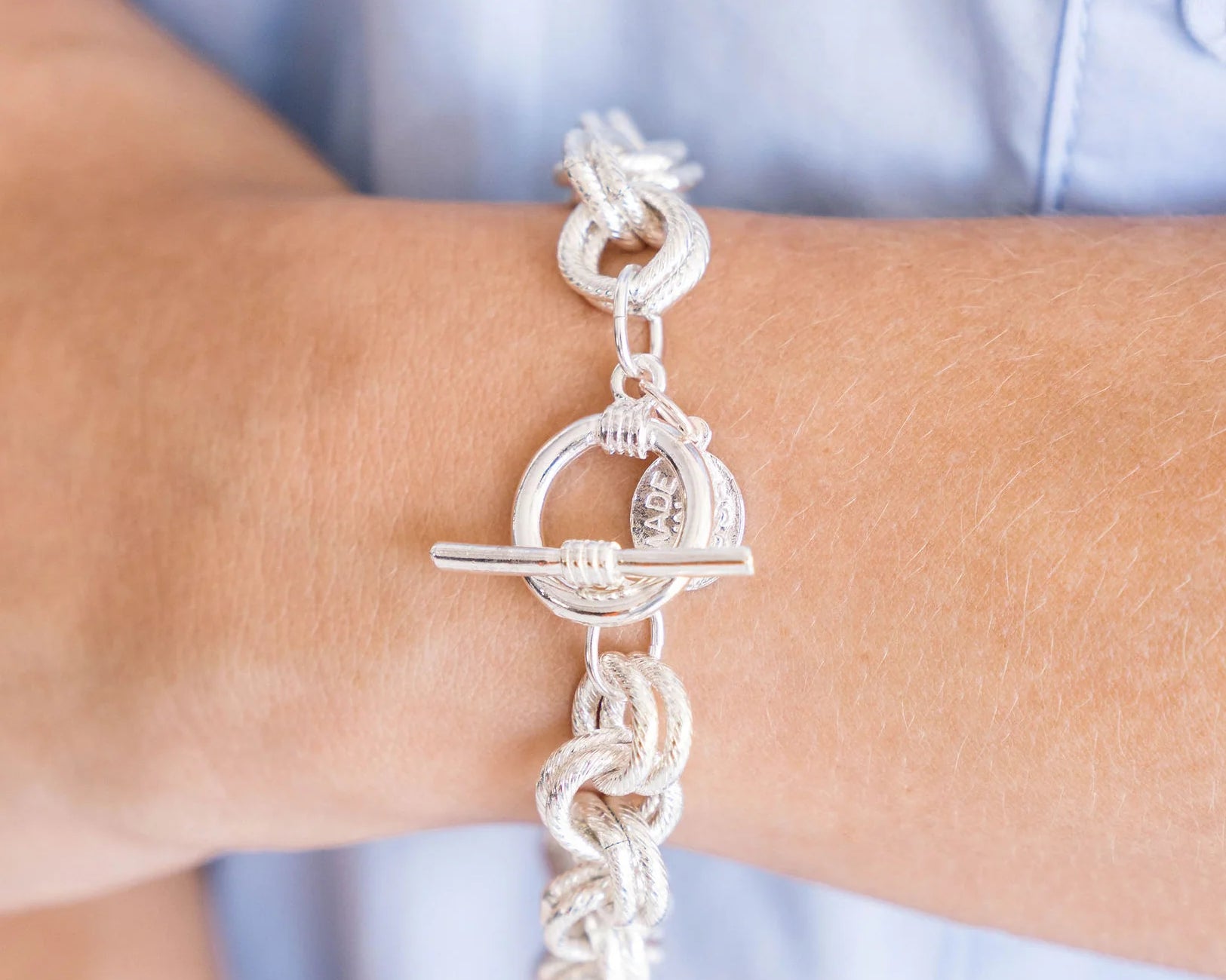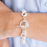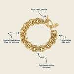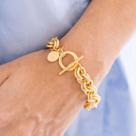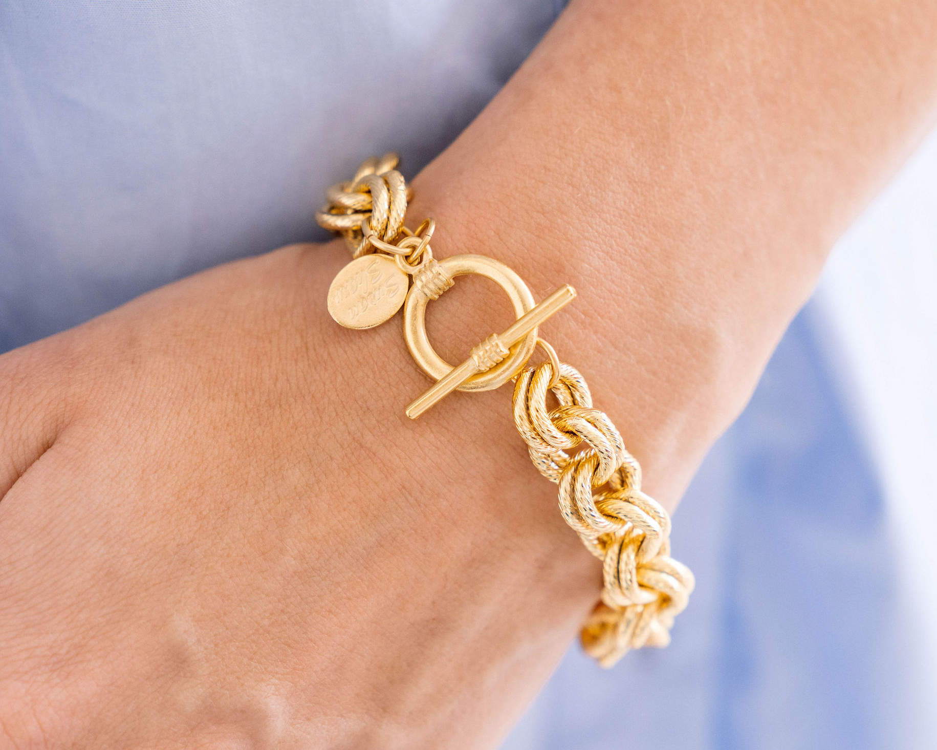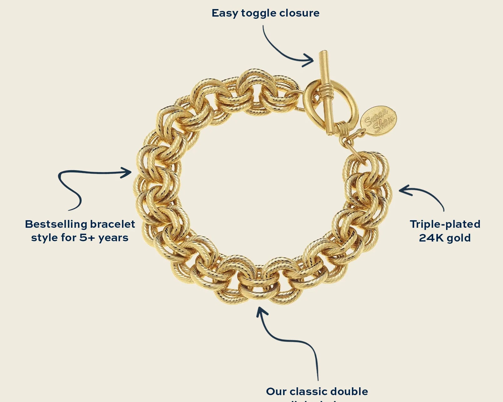Bold yet timeless, the Susan Shaw Double Link Chain Bracelet is a best-selling design that elevates any look with its effortless sophistication. Crafted by hand in San Antonio, Texas, this bracelet features a substantial double-link chain finished in triple-plated 24K gold or sterling silver plating. The toggle clasp adds a classic touch while ensuring a secure and comfortable fit.
