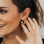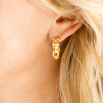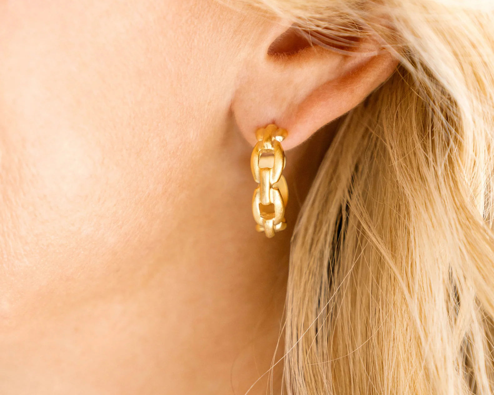 Each pair is handmade in San Antonio, Texas, and finished in triple-plated 24k gold for lasting brilliance. Measuring 0.94 inches, these hoops are lightweight and comfortable for all-day wear while offering just the right amount of edge and shine.