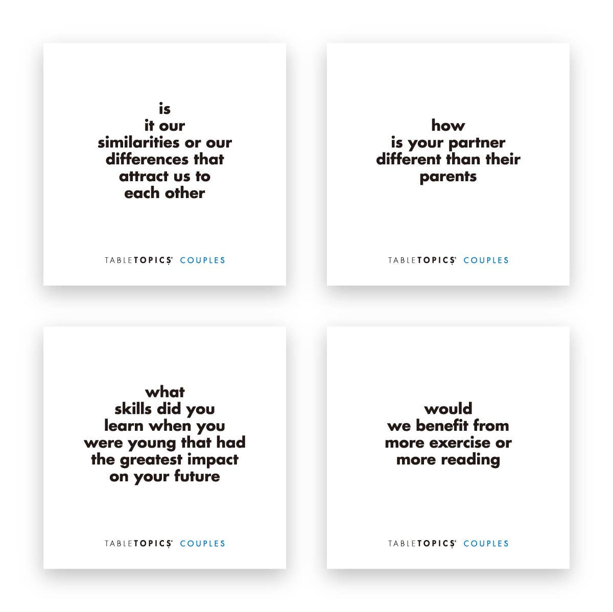 Discover new ways to connect with your partner with TableTopics for Couples. This set of 135 thought-provoking question cards encourages meaningful conversation, helping couples explore what makes each partner unique while strengthening the bond they share.