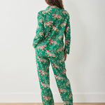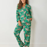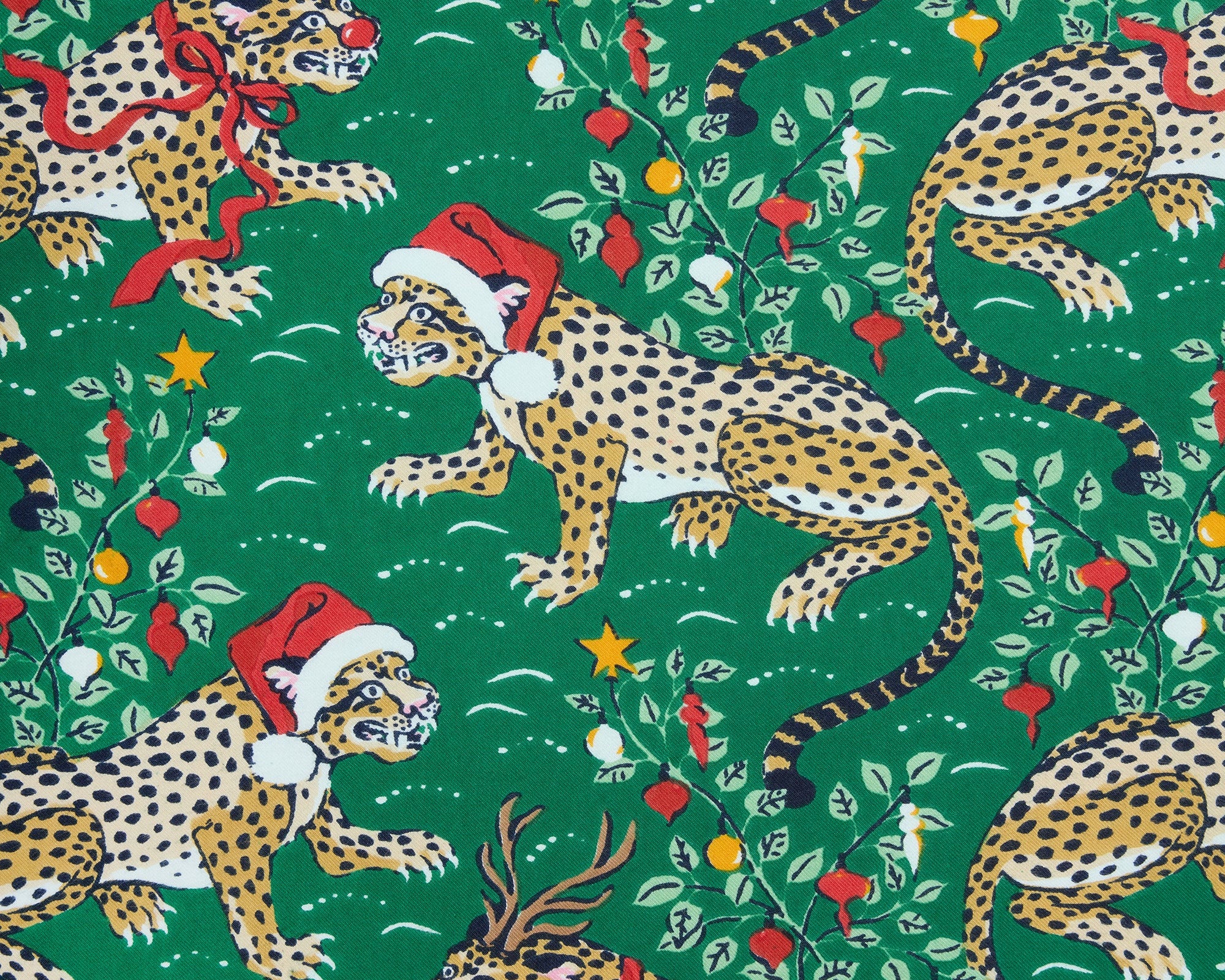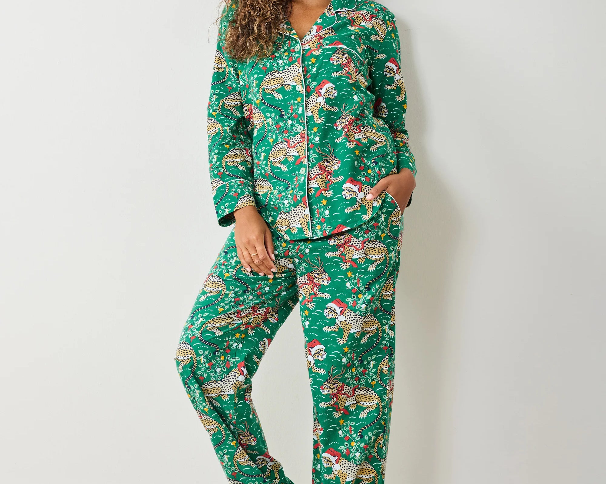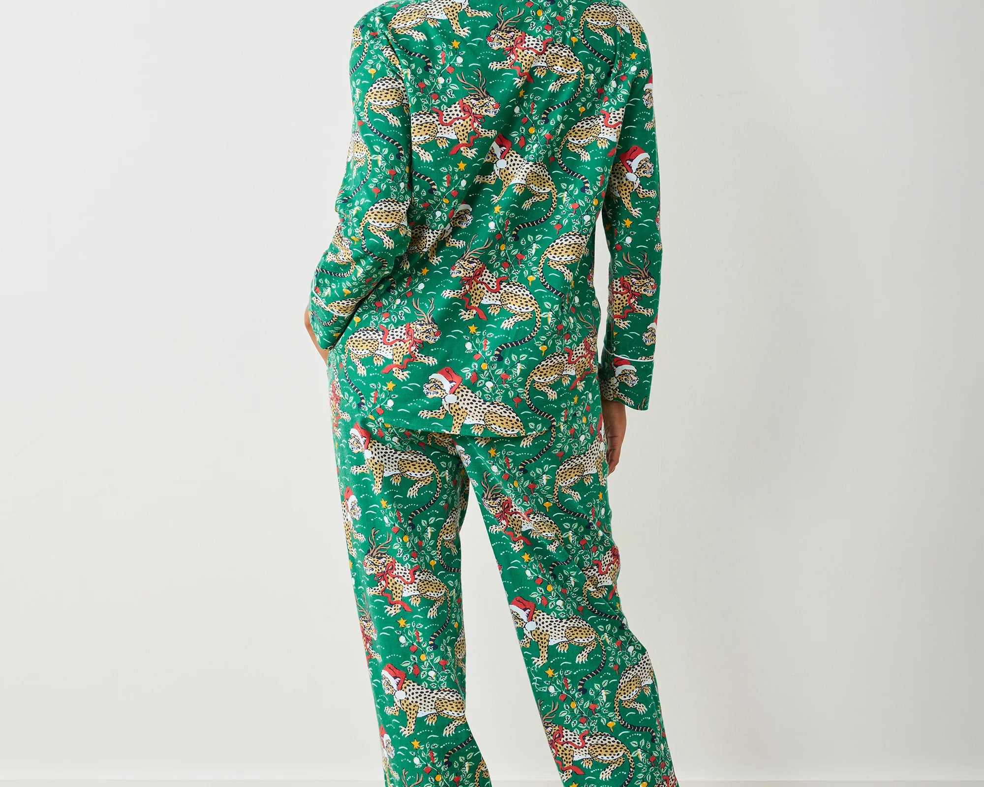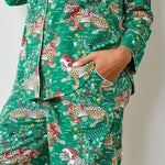 Our iconic leopard print gets a festive twist — complete with a Santa hat, red nose, and Rudolph antlers! Crafted from breathable organic cotton poplin, this holiday sleepwear set combines playful charm with effortless comfort. The classic button-down top pairs beautifully with relaxed cotton lounge pants featuring an elastic waistband, adjustable drawstring, and convenient pockets — perfect for cozy winter mornings and festive nights in.