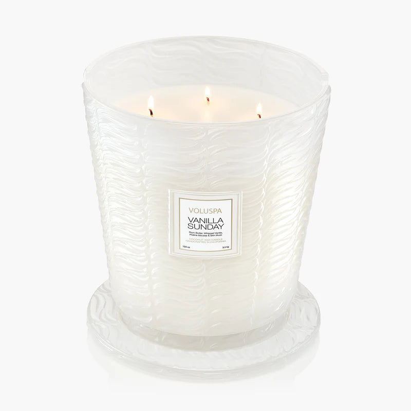 Make a bold, unforgettable statement with the Voluspa Vanilla Sunday Oversized 5-Wick Candle. Crafted with Voluspa’s signature proprietary coconut wax blend and housed in a stunning modern textured embossed glass vessel, this oversized luxury candle is designed to elevate both your space and your scent experience.